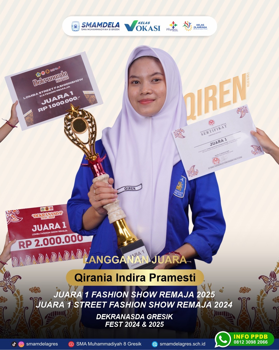Selamat kepada Qirania Indira Pramesti, siswi berbakat SMAMDELA (SMA Muhammadiyah 8 Gresik) yang kembali menorehkan prestasi gemilang! 🌟