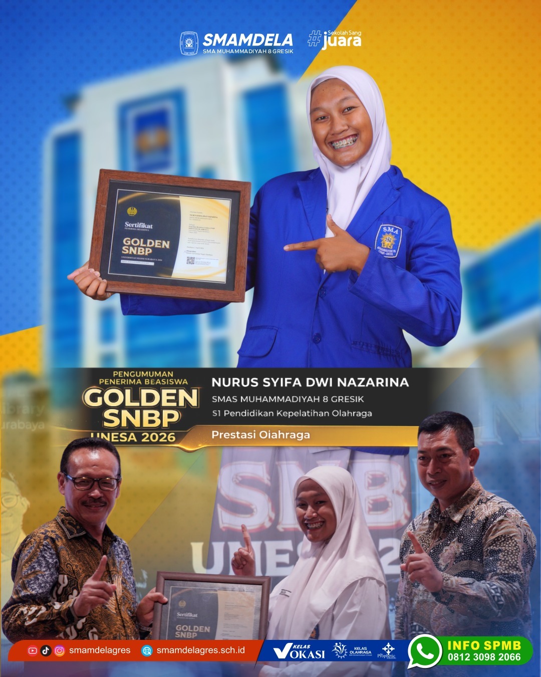 Selamat dan sukses kepada NURUS SYIFA DWI NAZARINA, siswi SMAS Muhammadiyah 8 Gresik, atas capaian luar biasa sebagai penerima Beasiswa Golden SNBP UNESA 2026 melalui jalur prestasi olahraga.
