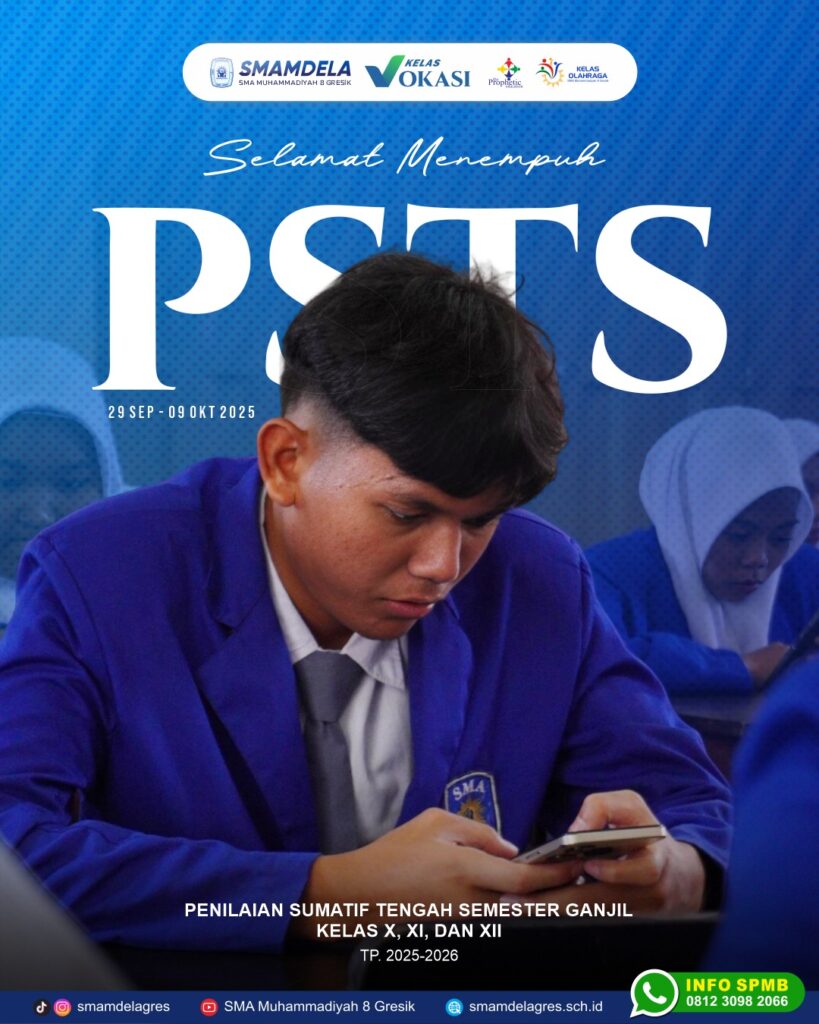 Selamat menempuh Penilaian Sumatif Tengah Semester (PSTS) Ganjil bagi seluruh siswa SMA Muhammadiyah 8 Gresik kelas X, XI, dan XII. Semoga diberi kemudahan, kelancaran, serta hasil terbaik sesuai usaha yang telah dilakukan. 💪🎓 Tetap semangat, fokus, dan percaya diri! #SMAMDELA #PSTS #SemangatBelajar #SiswaBerprestasi #Muhammadiyah