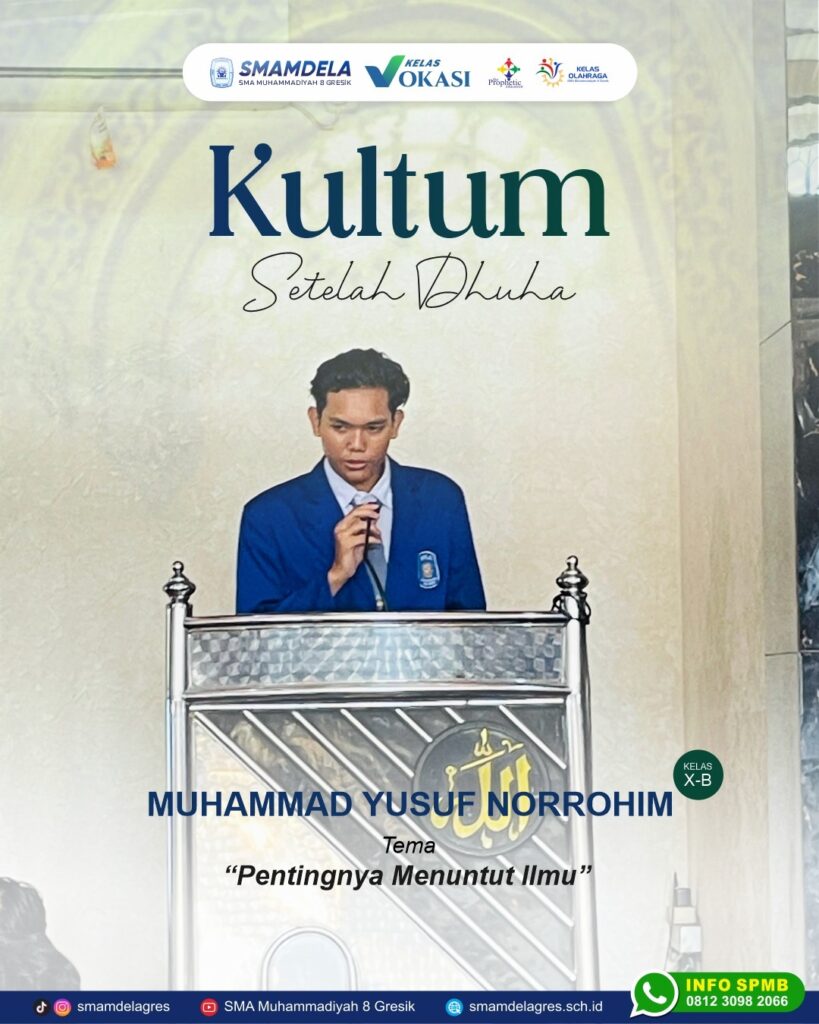 📚 Kultum Setelah Dhuha 📚 Hari ini kultum disampaikan oleh Muhammad Yusuf Norrohim (X-B) dengan tema: “Pentingnya Menuntut Ilmu” ✨ Menuntut ilmu adalah kewajiban bagi setiap muslim, karena dengan ilmu kita bisa membedakan antara yang benar dan salah, serta membekali diri untuk menghadapi tantangan kehidupan. Rasulullah SAW bersabda bahwa menuntut ilmu adalah jalan menuju surga, karena ilmu akan menuntun kita pada amal yang benar dan bermanfaat. Melalui kultum ini, kita diingatkan kembali untuk tidak pernah lelah mencari ilmu, baik ilmu agama maupun ilmu dunia, serta mengamalkannya dengan sebaik-baiknya. Semoga kita semua menjadi insan yang berilmu, berakhlak, dan bermanfaat bagi sesama 🤲🌸 #SMAMDELA #KultumDhuha #SMAMuhammadiyah8Gresik #PelajarBerilmu #MenuntutIlmu