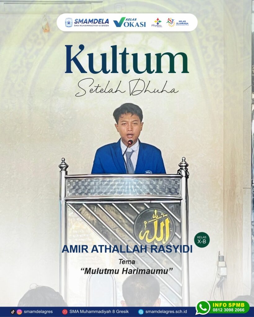 🕌 Kultum Setelah Dhuha 🕌 Hari ini kultum disampaikan oleh Amir Athallah Rasyidi (X-B) dengan tema: “Mulutmu Harimaumu” Ucapan adalah cermin hati. Dari lisan bisa lahir doa, nasihat, dan kebaikan. Namun, dari lisan pula bisa muncul fitnah, kebohongan, bahkan permusuhan. Itulah mengapa Rasulullah SAW mengingatkan kita untuk senantiasa menjaga perkataan, karena setiap kata akan dipertanggungjawabkan di hadapan Allah SWT. Melalui kultum ini, kita diajak untuk lebih berhati-hati dalam berbicara. Gunakan lisan untuk hal-hal yang bermanfaat, menenangkan hati, dan mendatangkan pahala. Jangan sampai ucapan kita justru menjadi bumerang yang merugikan diri sendiri maupun orang lain. Semoga kita senantiasa diberi kekuatan untuk menjaga lisan agar selalu membawa kebaikan 🤲✨ #SMAMDELA #KultumDhuha #SMA Muhammadiyah8Gresik #PelajarBerakhlak #MulutmuHarimaumu