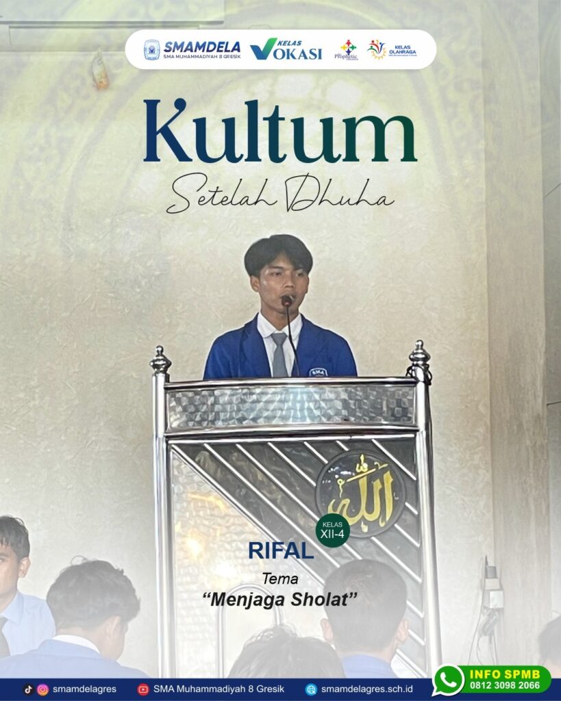 🌙 Kultum Setelah Dhuha 🌙 Hari ini kultum disampaikan oleh Rifal (XII-4) dengan tema: “Menjaga Sholat” 🕌✨ Sholat adalah tiang agama, penentu baik atau buruknya amal seorang hamba. Dengan menjaga sholat, berarti kita menjaga hubungan dengan Allah SWT sekaligus memperbaiki diri dalam kehidupan sehari-hari. Melalui kultum ini, kita diingatkan kembali bahwa sholat bukan hanya kewajiban, tetapi juga kebutuhan yang akan menenangkan hati, menguatkan jiwa, serta menjadi cahaya di dunia dan akhirat. Semoga kita semua senantiasa istiqamah menjaga sholat tepat waktu dan penuh kekhusyukan 🤲💙 #SMAMDELA #KultumDhuha #SMA Muhammadiyah8Gresik #PelajarBerakhlak #MenjagaSholat