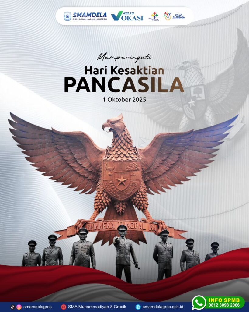 ✨🇮🇩 Hari Kesaktian Pancasila 🇮🇩✨ 1 Oktober 2025 Hari ini kita mengenang kembali perjuangan para pahlawan bangsa yang telah gugur dalam mempertahankan ideologi Pancasila. Sebagai generasi penerus, mari kita jadikan Pancasila sebagai pedoman hidup dalam menjaga persatuan, menegakkan keadilan, dan merawat kebhinekaan. 🔸 Pancasila adalah jiwa bangsa 🔸 Pancasila adalah pemersatu kita 🔸 Pancasila adalah nafas Indonesia Mari terus mengamalkan nilai-nilai luhur Pancasila dalam setiap langkah kehidupan kita 🙌 #HariKesaktianPancasila #1Oktober #SMAMDELA #Smamdelagres #PelajarPancasila