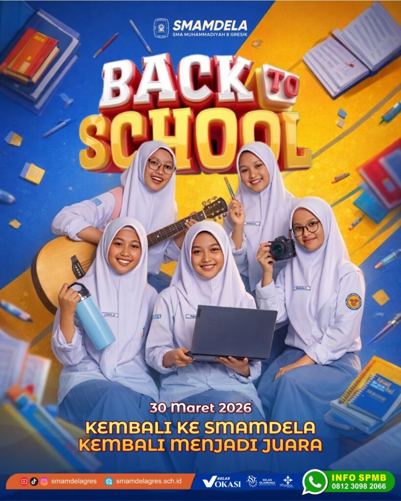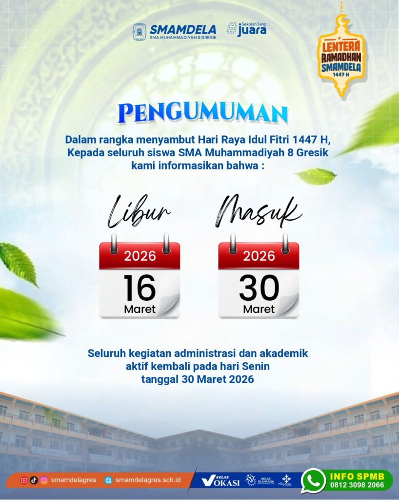 Dalam rangka menyambut Hari Raya Idul Fitri 1447 H, seluruh siswa SMA Muhammadiyah 8 Gresik diinformasikan bahwa: 📆 Libur dimulai tanggal 16 Maret 2026 📆 Masuk kembali tanggal 30 Maret 2026 Seluruh kegiatan administrasi dan akademik akan aktif kembali pada Senin, 30 Maret 2026. Semoga momen Idul Fitri menjadi waktu untuk mempererat silaturahmi dan kembali dengan semangat baru ✨ #SMAMDELA #SekolahSangJuara #LenteraRamadhan #IdulFitri1447H #InfoSekolah