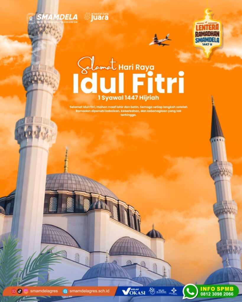 Keluarga Besar SMA Muhammadiyah 8 Gresik (SMAMDELA) mengucapkan: _Taqabbalallahu minna wa minkum, shiyamana wa shiyamakum._ _Minal ‘aidin wal faizin, mohon maaf lahir dan batin._ Hari kemenangan telah tiba, saatnya kembali kepada fitrah dengan hati yang bersih, saling memaafkan, dan mempererat ukhuwah. Semoga setiap amal ibadah di bulan Ramadhan diterima oleh Allah SWT, serta membawa keberkahan dalam langkah kita ke depan. Mari terus menjadi pribadi yang beriman kokoh, berakhlak mulia, dan berprestasi, sejalan dengan semangat SMAMDELA dalam mencetak generasi unggul dan berkemajuan. #IdulFitri1447H #SMAMDELA #SekolahBerkarakter #Muhammadiyah #Berkemajuan