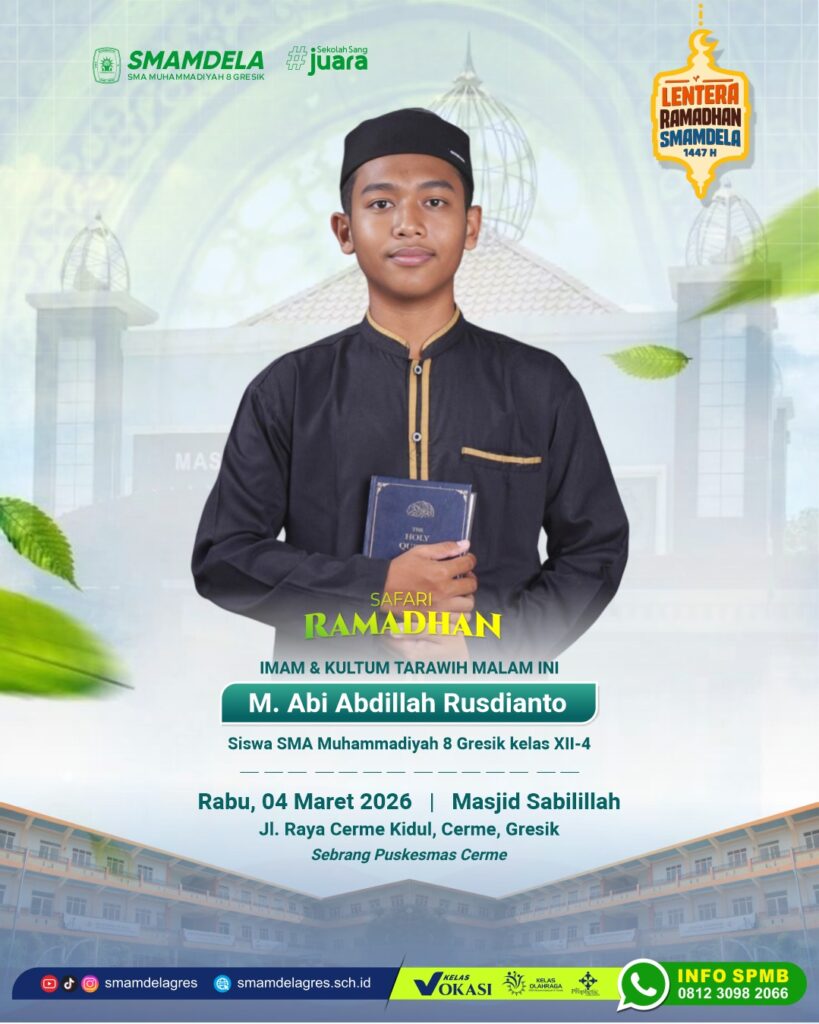 Alhamdulillah, Safari Ramadhan SMAMDELA kembali hadir sebagai bagian dari ikhtiar menebar cahaya kebaikan di bulan suci. Malam ini, Imam & Kultum Tarawih akan disampaikan oleh: ✨ *M. Yusuf Siddiqi* *Siswa SMA Muhammadiyah 8 Gresik* 📅 Ahad, 01 Maret 2026 📍 Masjid Sabilillah Jl. Raya Cerme Kidul, Cerme, Gresik (Sebrang Puskesmas Cerme) Semoga setiap langkah menjadi amal jariyah, setiap lantunan ayat membawa ketenangan, dan setiap nasihat menambah keimanan. Mari bersama hidupkan Ramadhan dengan ibadah, dakwah, dan akhlak terbaik 🤲✨ #SafariRamadhan #LenteraRamadhan #SMAMDELA #SekolahSangJuara #Ramadhan1447H