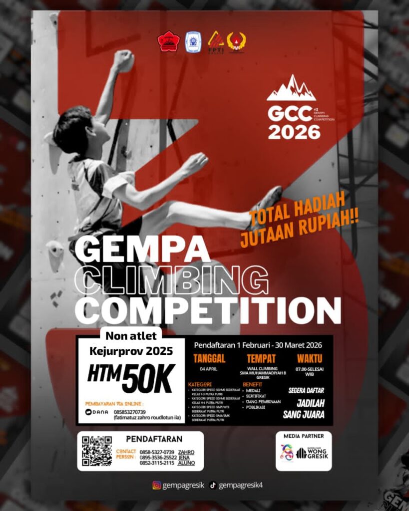 Assalamu’alaikum Wr. Wb. Kami informasikan kepada Bapak/Ibu serta ananda, bahwa akan diselenggarakan: GEMPA Climbing Competition (GCC) 2026 🗓 Tanggal : 4 April 2026 📍 Tempat : Wall Climbing SMA Muhammadiyah 8 Gresik ⏰ Waktu : 07.00 WIB – selesai 📝 Pendaftaran : 1 Februari – 30 Maret 2026 💰 HTM : Rp50.000 🏆 Kategori : Lead & Speed SD/MI sederajat (Putra/Putri) Lead & Speed SMP/MTs sederajat (Putra/Putri) 🎁 Benefit : Medali, Sertifikat, Uang Pembinaan, dan Publikasi ✨ Total hadiah jutaan rupiah Bagi ananda yang berminat, silakan segera mendaftar melalui QR code atau menghubungi contact person pada poster. Terima kasih atas perhatian dan partisipasinya. Wassalamu’alaikum Wr. Wb.