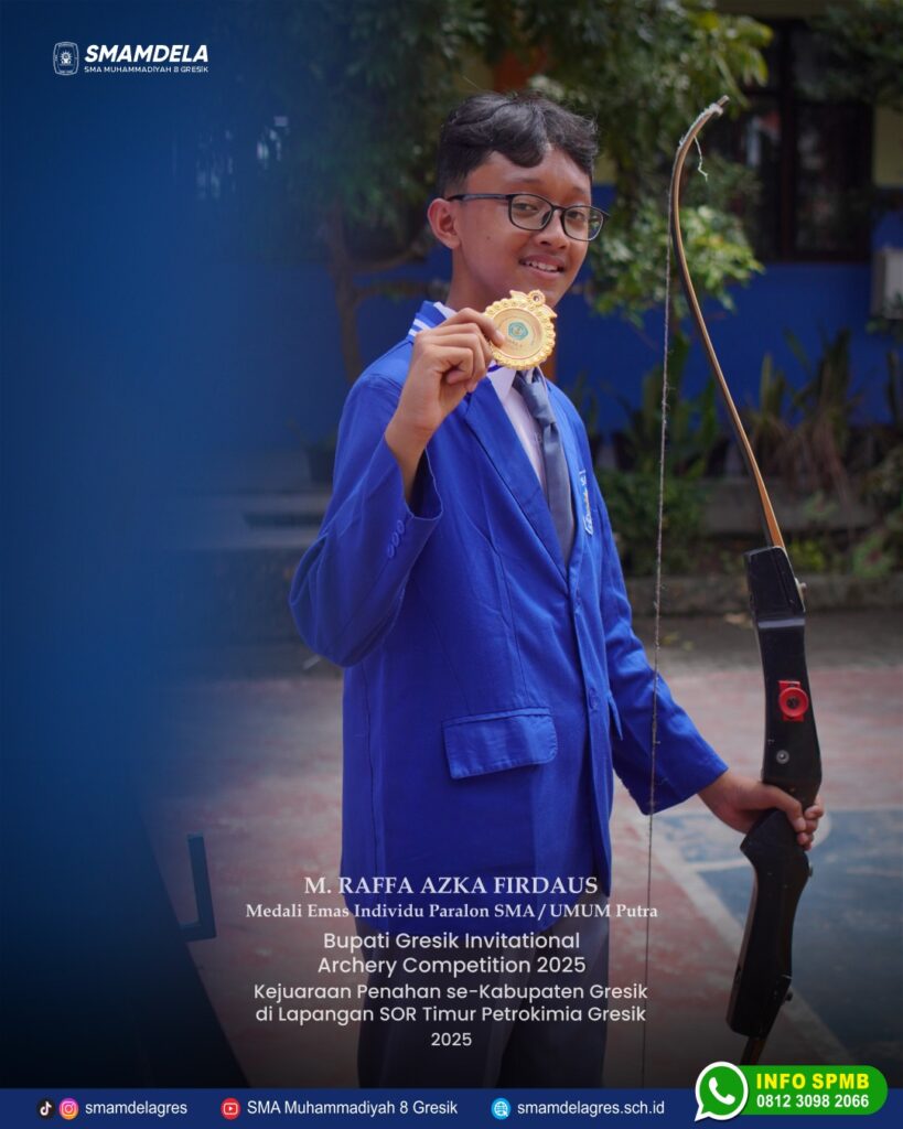 Prestasi gemilang kembali diraih oleh siswa SMAMDELA. Selamat kepada M. Raffa Azka Firdaus yang berhasil meraih Medali Emas Individu Paralon SMA/Umum Putra pada Bupati Gresik Invitational Archery Competition 2025. Semoga prestasi ini menjadi awal dari capaian-capaian hebat selanjutnya. Terus berkarya dan berprestasi. #SMAMDELA #PrestasiSiswa #JuaraPanahan #ArcheryCompetition #BupatiGresikInvitational #BanggaSMAMDELA