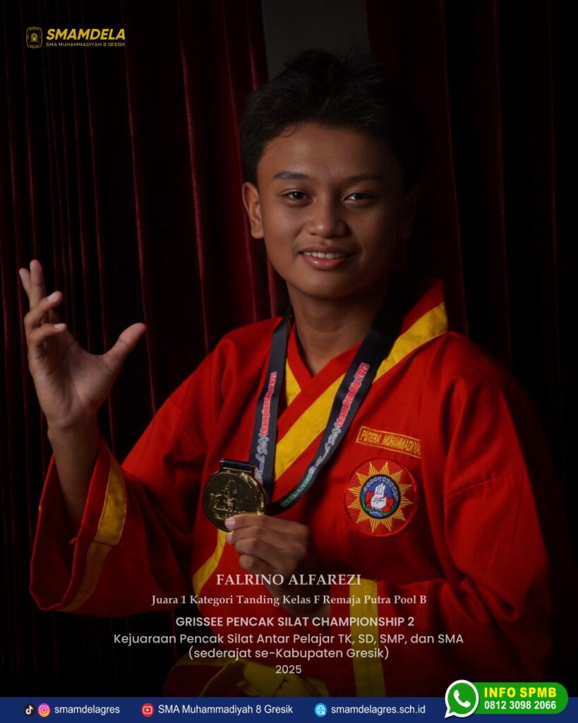 Bangga atas pencapaian Falrino Alfarezi yang sukses meraih Juara 1 Kategori Tanding Kelas F Remaja Putra Pool B dalam Grissee Pencak Silat Championship 2 tahun 2025. Semangat pantang menyerah dan sportivitas menjadi kunci prestasi gemilang ini. #SMAMDELA #PrestasiSMAMDELA #PencakSilat #Juara1 #TandingPutra #TapakSuci #PelajarBerprestasi #Gresik