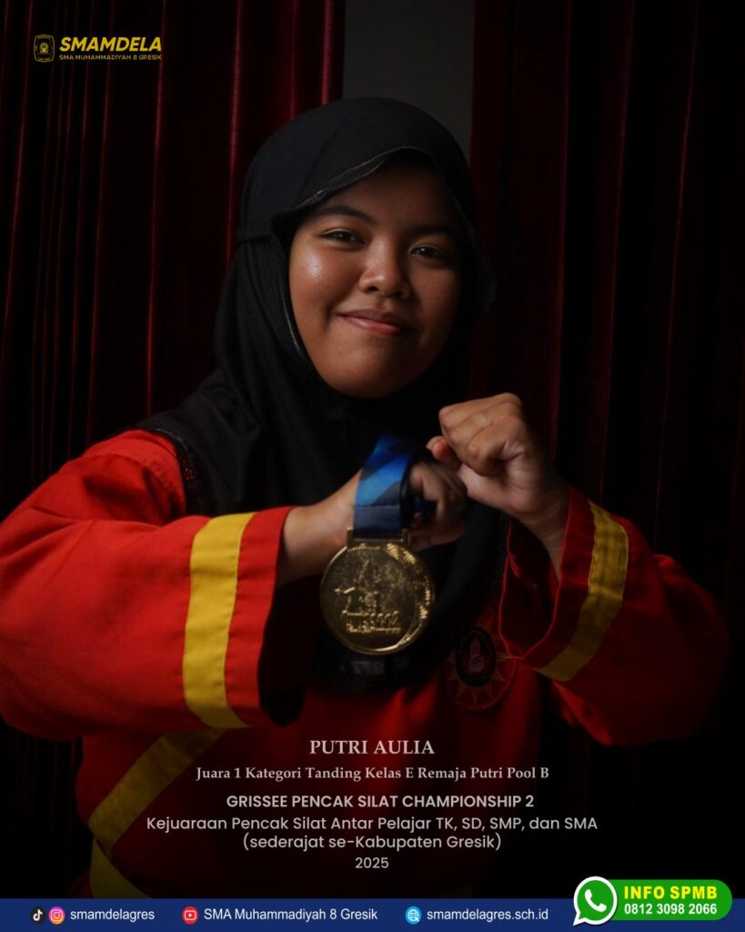 Prestasi membanggakan kembali ditorehkan oleh Putri Aulia. Dengan kerja keras, disiplin, dan semangat juang tinggi, berhasil meraih Juara 1 Kategori Tanding Kelas E Remaja Putri Pool B pada Grissee Pencak Silat Championship 2 tingkat Kabupaten Gresik tahun 2025. Terus melangkah, terus berprestasi. #SMAMDELA #PrestasiSMAMDELA #PencakSilat #Juara1 #GrisseePencakSilat #TapakSuci #PelajarBerprestasi #Gresik