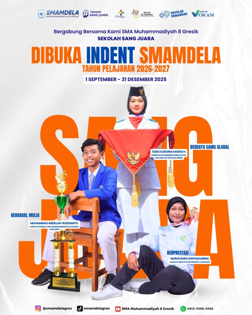 SMA Muhammadiyah 8 Gresik (SMAMDELA) merupakan sekolah terakreditasi A dan terpilih menjalankan program sekolah penggerak angkatan 2. Proses belajar mengajar menerapkan kurikulum merdeka. Dengan Visi “Mewujudkan generasi yang berakhlak, berprestasi dan berdaya saing”. SMAMDELA memiliki berbagai program unggulan untuk siswa/siswi yang ingin melanjutkan ke jenjang kuliah atau langsung bergabung di dunia usaha dan dunia industri (DUDI) 📌Program Unggulan 1. Kelas Olahraga 2. Kelas Tahfidzul Qur’an 3. Kelas Vokasi : a. Tata Boga b. Tata Rias c. Desain Komunikasi Visual ( DKV ) d. Teknik Pengelasan e. Teknik Sepeda Motor (TSM) f. Kimia Industri 4. Kelas Sukses PTN 🗓 Jadwal Gelombang Indent 1 September – 31 Desember 2025 ‼Dapatkan Beasiswa Pendidikan up to 3 tahun 🏷 * *syarat dan ketentuan berlaku Segera bergabung untuk kamu yang ingin lanjut kuliah atau langsung kerja!