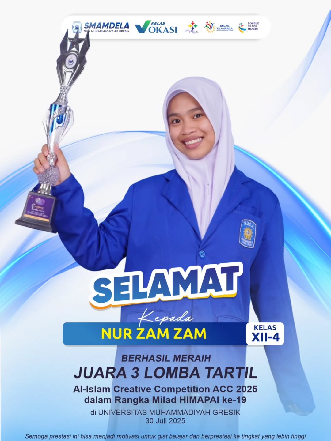 Selamat kepada Nur Zam Zam atas prestasinya meraih prestasi Juara 3 Lomba Tartil Al Islam Creative Competition ACC 2025
