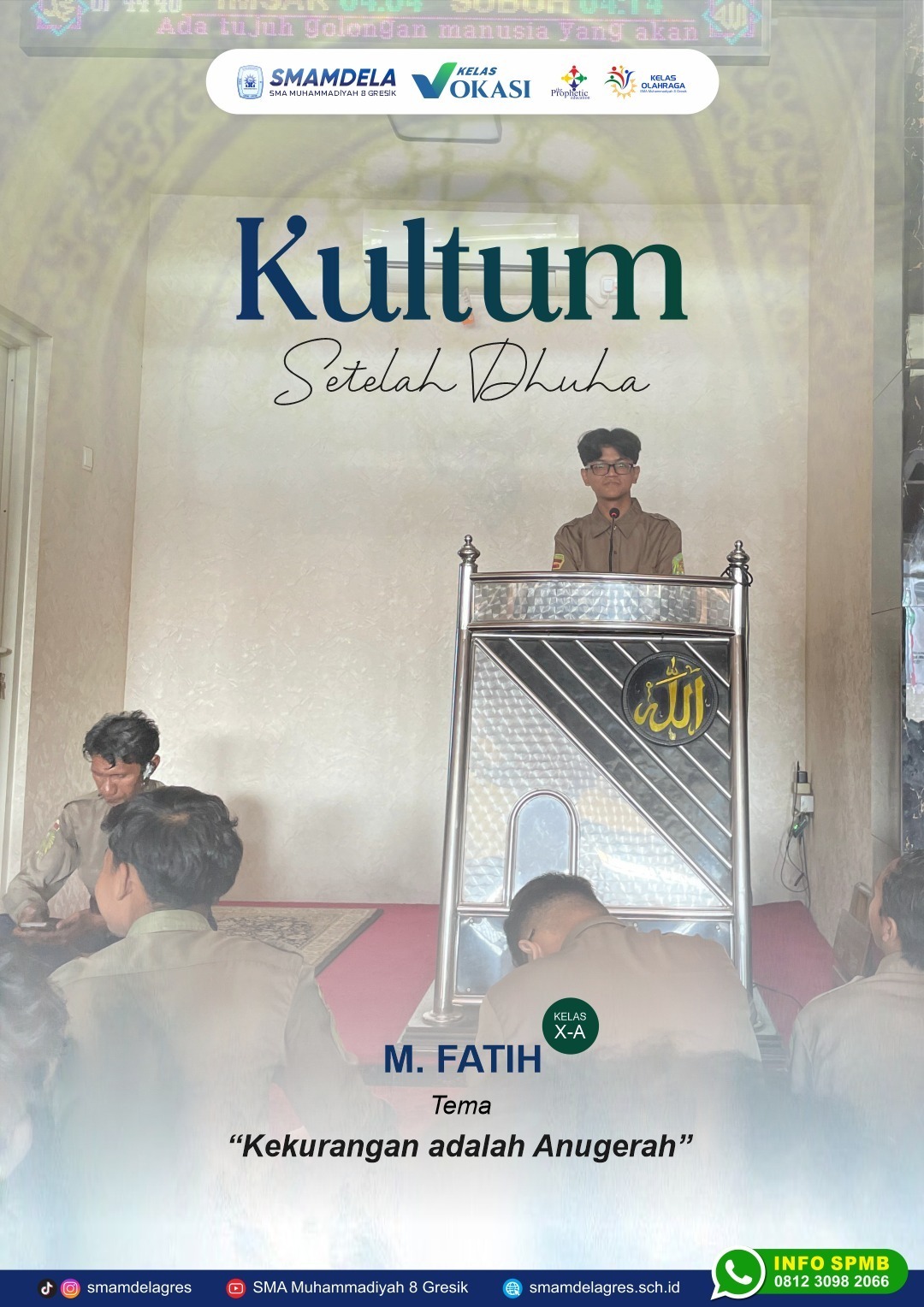 Hari ini, M. Fatih (X-A) menyampaikan kultum dengan tema “Kekurangan adalah Anugerah”.