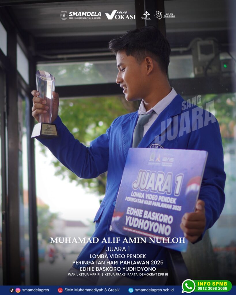 Selamat kepada Muhamad Alif Amin Nulloh Siswa SMA Muhammadiyah 8 Gresik Juara 1 Lomba Video Pendek Peringatan Hari Pahlawan 2025 oleh Edhie Baskoro Yudhoyono Prestasi ini menjadi bukti bahwa kerja keras, kreativitas, dan kepercayaan diri mampu membawa siswa SMAMDELA meraih pencapaian terbaiknya. Semoga prestasi ini menjadi inspirasi bagi seluruh pelajar untuk terus berkarya, berani mencoba hal baru, dan memberikan dampak positif bagi lingkungan sekitar. SMAMDELA bangga! Teruslah melangkah, Sang Juara. #SMAMDELA #SangJuara #SekolahSangJuara #PelajarMuhammadiyah #PrestasiSiswa #HariPahlawan2025 #Gresik #AUM #AnakMudaBerkarya