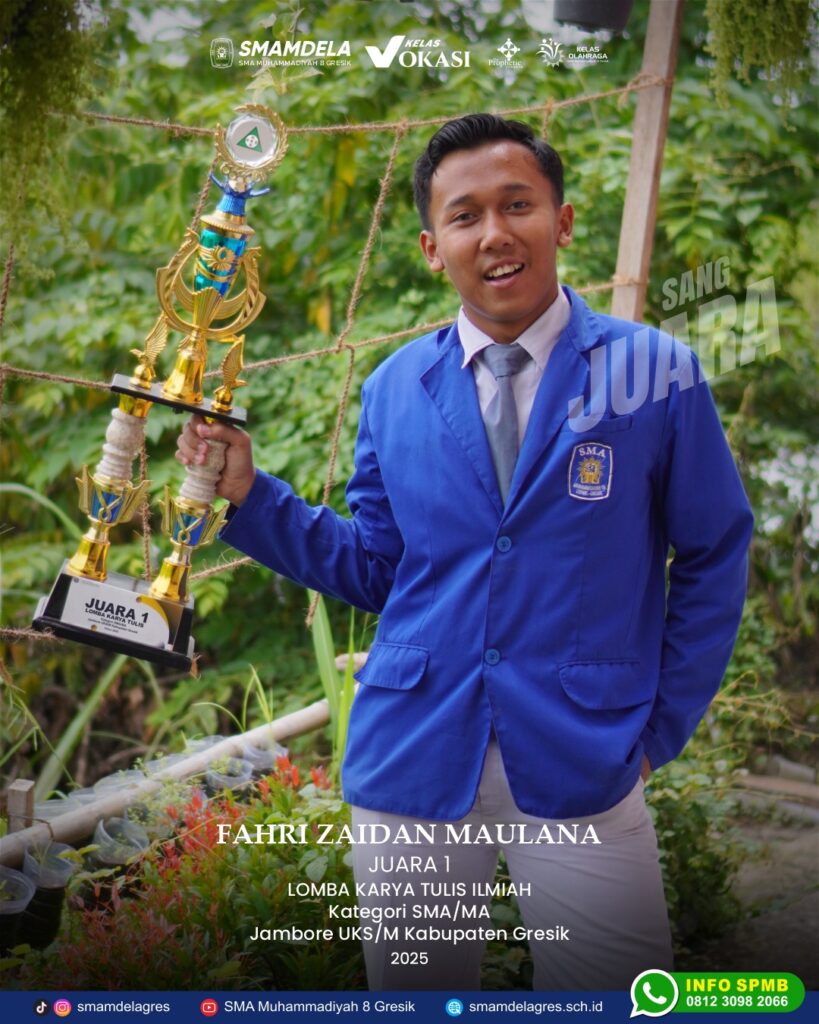 Selamat kepada Fahri Zaidan Maulana Siswa SMA Muhammadiyah 8 Gresik Juara 1 Lomba Karya Tulis Ilmiah Kategori SMA/MA Jambore UKS/M Kabupaten Gresik 2025 Prestasi ini menunjukkan bahwa kemampuan berpikir kritis, kedisiplinan dalam meneliti, serta kemauan untuk terus belajar adalah kunci lahirnya karya-karya berkualitas. Fahri telah membuktikan bahwa pelajar SMAMDELA mampu berprestasi tidak hanya di bidang olahraga, tetapi juga dalam dunia ilmiah dan akademik. Semoga pencapaian ini menjadi motivasi bagi seluruh siswa untuk berani menuangkan ide, melakukan riset, dan menghadirkan kontribusi nyata bagi masyarakat. SMAMDELA bangga! Teruslah berkarya, Sang Juara. #SMAMDELA #SangJuara #SekolahSangJuara #KaryaTulisIlmiah #JamboreUKS #PrestasiSiswa #Gresik #PelajarMuhammadiyah #AUM