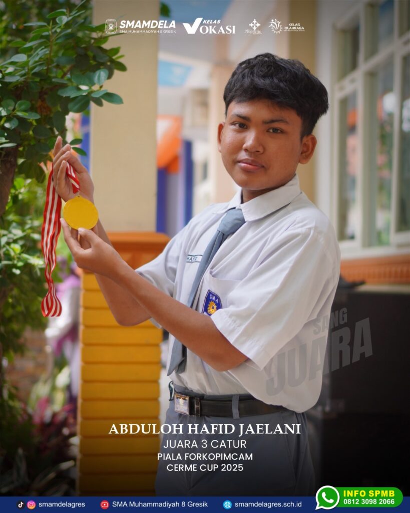 Selamat kepada Abduloh Hafid Jaelani Siswa SMA Muhammadiyah 8 Gresik Juara 3 Catur Piala Forkopimcam Cerme Cup 2025 Prestasi ini menunjukkan bahwa ketenangan, strategi, dan konsistensi dalam berpikir mampu membawa hasil yang membanggakan. Hafid berhasil membuktikan bahwa olahraga otak pun dapat menjadi ruang bagi pelajar SMAMDELA untuk unjuk kemampuan dan meraih pencapaian. Teruslah mengasah kemampuan dan melangkah menjadi lebih baik setiap harinya. SMAMDELA bangga, Sang Juara! #SMAMDELA #SangJuara #PrestasiSiswa #Catur #CermeCup2025 #PelajarMuhammadiyah #Gresik #SekolahSangJuara