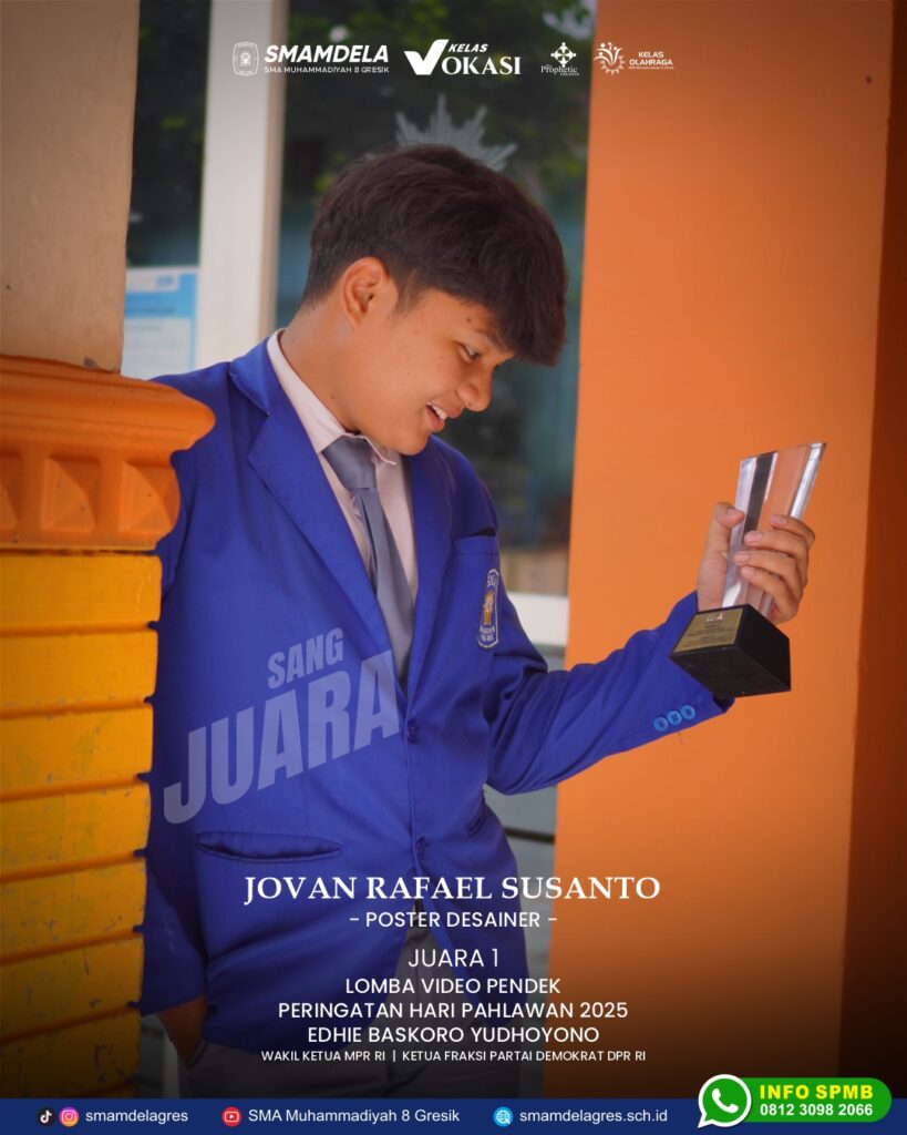 Sang Juara dari SMAMDELA! Selamat kepada Jovan Rafael Susanto, siswa SMAMDELA sekaligus desainer poster berbakat, yang berhasil meraih Juara 1 Lomba Video Pendek Peringatan Hari Pahlawan 2025 oleh Edhie Baskoro Yudhoyono (Wakil Ketua MPR RI / Ketua Fraksi Partai Demokrat DPR RI). Prestasi ini menjadi bukti bahwa kreativitas, kerja keras, dan ketekunan mampu membawa siswa SMAMDELA melangkah lebih jauh. Semoga pencapaian ini menginspirasi teman-teman lain untuk terus berkarya dan menunjukkan yang terbaik. SMAMDELA, unggul dalam karya dan prestasi. #SMAMDELA #SMAMDELAHebat #SiswaBerprestasi #PrestasiSMAMDELA #HariPahlawan2025 #LombaVideoPendek #Juara1 #PelajarIndonesia #SekolahMuhammadiyah #Muhammadiyah #AUMGresik #Gresik #PelajarBerprestasi #AnakMudaBerkarya #KelasVokasiSMAMDELA